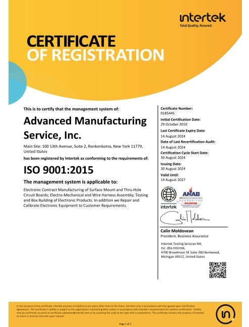 Advanced Manufacturing Service’s quality objectives are to provide quality products to its customers in accordance with the customer’s requirements. AMS has adapted IPC-A-610 and J-STD-001 Class II & Class III as its workmanship standards. AMS is an ISO 9001:2015 certified company.